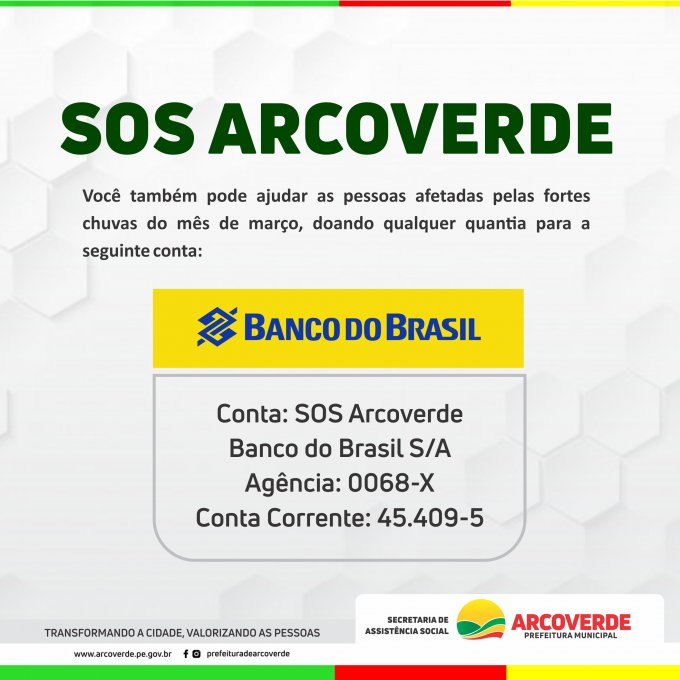 DOAÇÕES - A conta bancária foi aberta no Banco do Brasil S/A, sendo intitulada de S.O.S. Arcoverde e está disponível para o recebimento das doações financeiras, através da Agência: 0068-X e da Conta Corrente nº 45.409-5.
